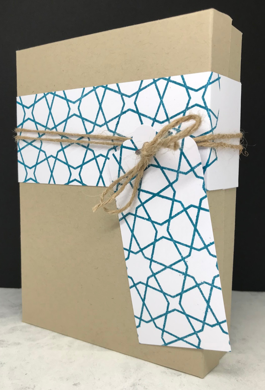 A belly band and tag for each box completed the construction. They were held together with twine for the masculine box and an elastic bow (rescued from a chocolate box - my recycled item) for my feminine box.