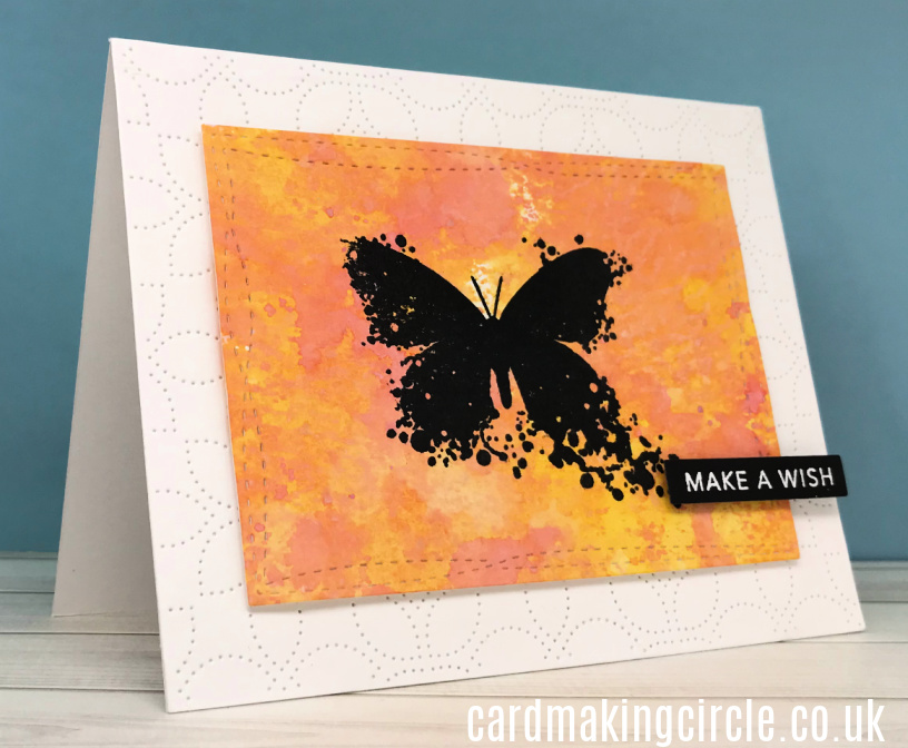 With this card I used wilted violet and cracked pistachio distress oxide inks. I flicked some water droplets over the blended card to create some texture. Absorbing the water with a sheet of kitchen paper.